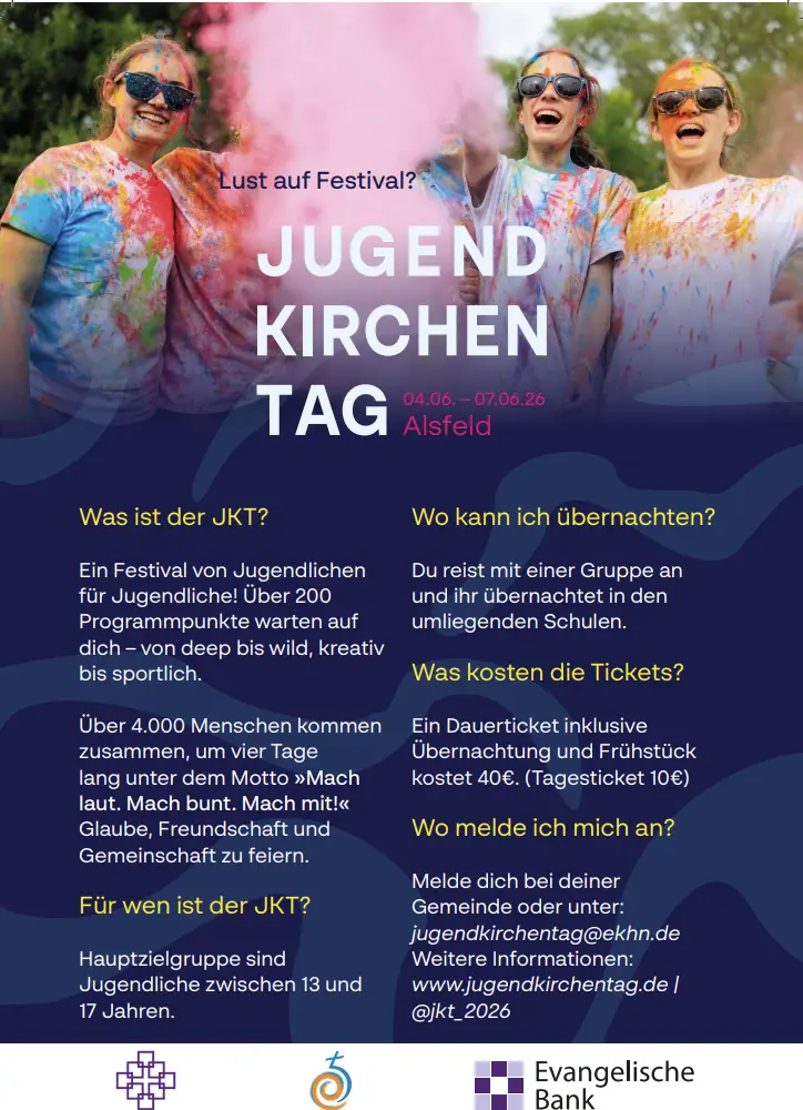 Von 4. bis 7. Juni 2026 wird Alsfeld zum Treffpunkt für tausende junge Menschen: Der Jugendkirchentag der EKHN lädt zu einem langen Wochenende voller Musik, Aktionen, Workshops, Gottesdiensten und Gemeinschaft ein. Das Festival steht 2026 unter dem Motto „Mach laut. Mach bunt. Mach mit!“ und wird von Jugendlichen mitgestaltet. Offiziell angekündigt sind mehr als 200 Programmpunkte; erwartet werden rund 4.500 junge Menschen.